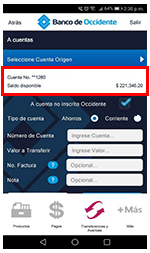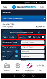 3. Elige el tipo de cuenta OCCIDENTE (ahorro o corriente), digita el número y el valor a transferir.